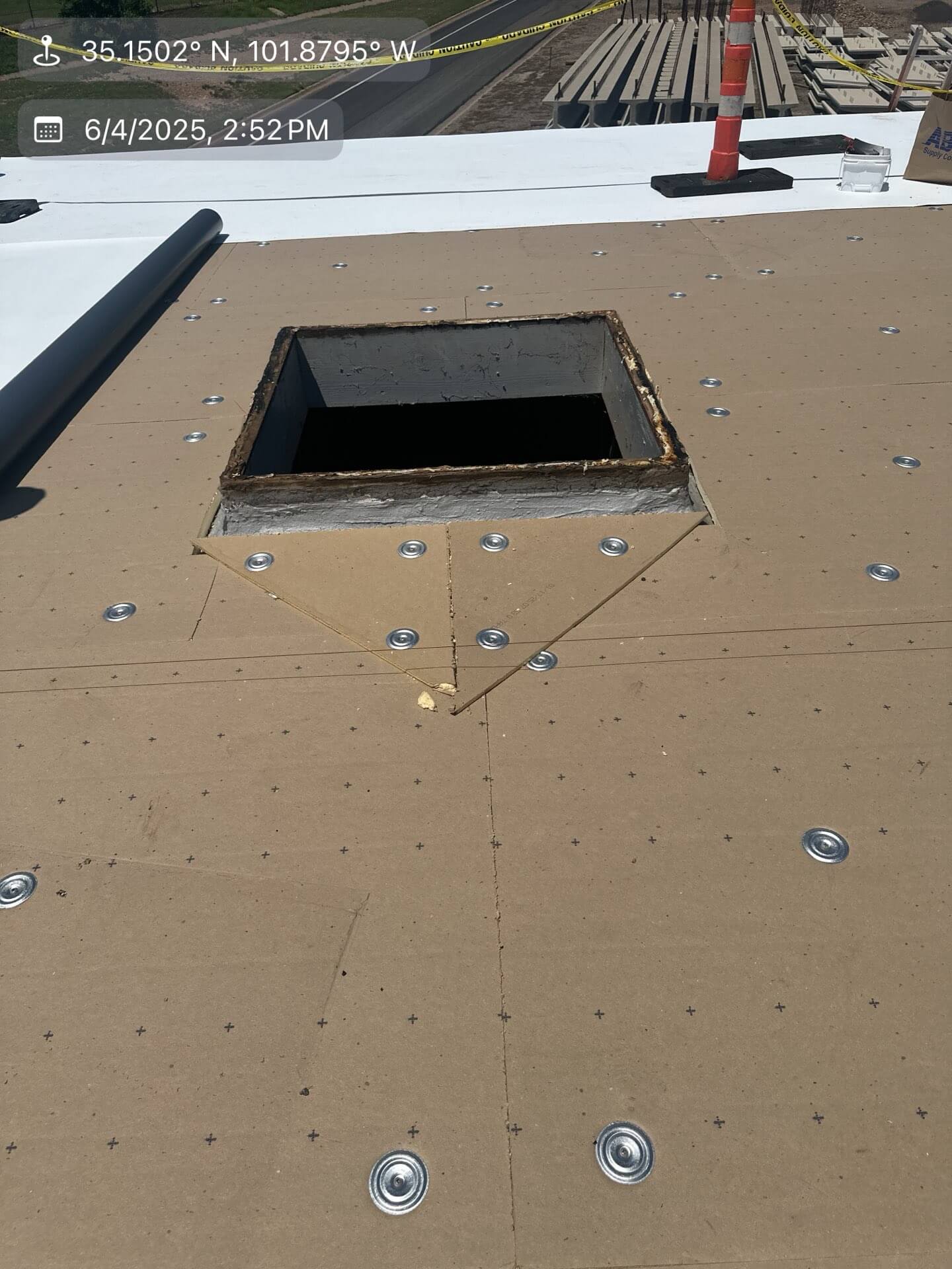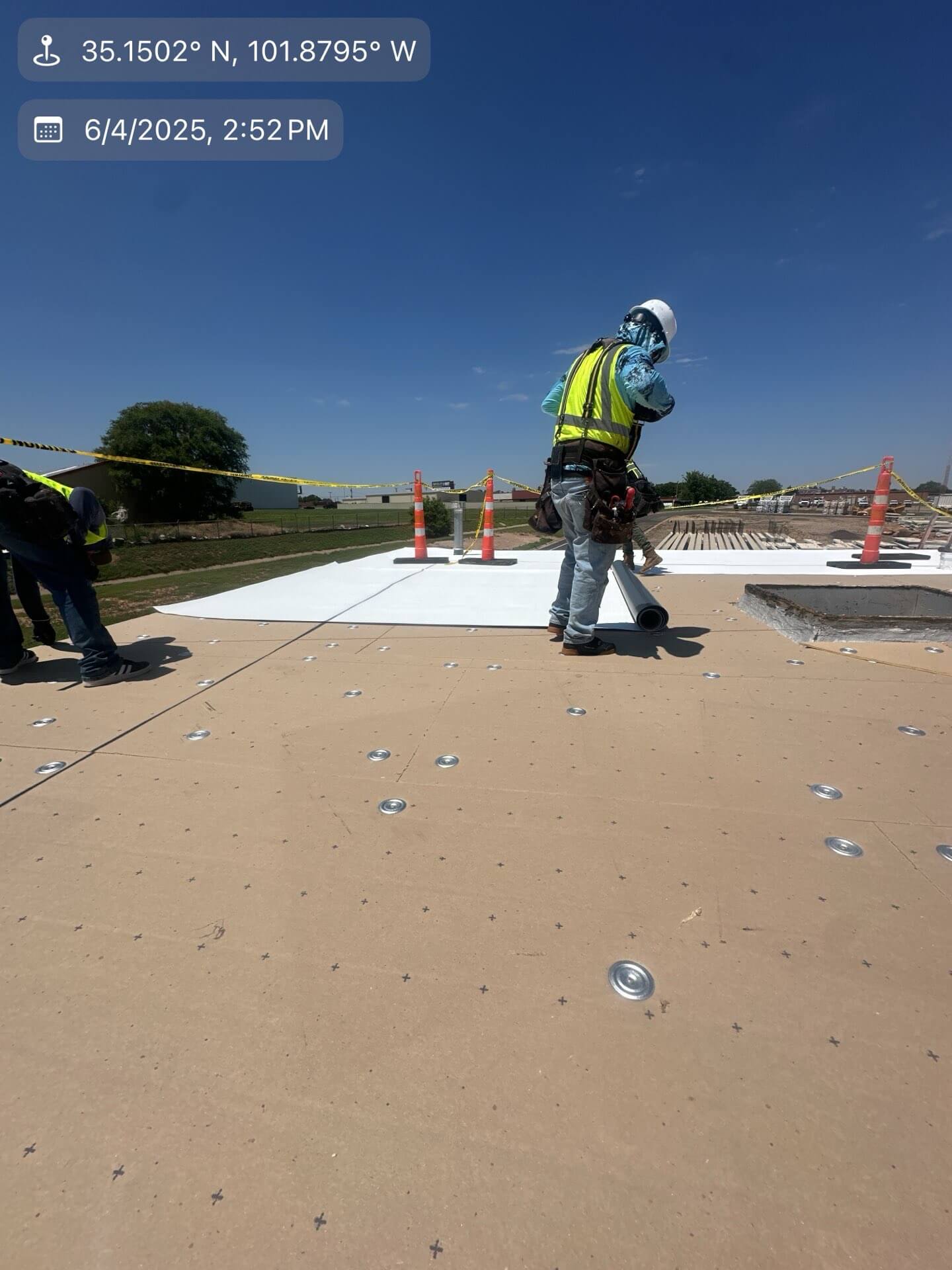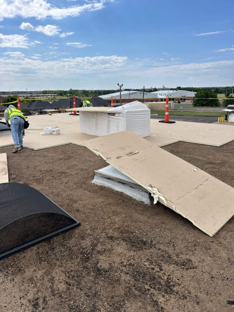 For the new membrane, we applied a fully adhered 60 mil TPO system. TPO (thermoplastic polyolefin) is known for its excellent weatherability, UV resistance, and long-term durability. The fully adhered method provides a tight, secure bond that resists wind uplift—an important consideration in the often harsh West Texas climate.